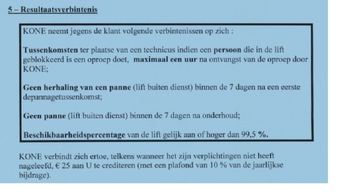 Ein Trost: Sie garantieren eine Verfügbarkeit von mehr als 99,5 % der Aufzüge. Und sie sind sich so sicher, dass sie diese Verpflichtung einhalten, dass sie uns sogar eine Entschädigung von 25 € zusagen, falls sie diese nicht einhalten sollten.