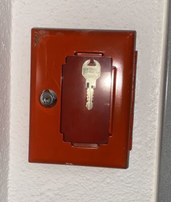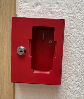 Bei einem Spaziergang im fünften Stock beobachtete ich, dass die Fluchttüren zwar verschlossen waren, der Schlüssel aber in den meisten Fällen aus dem roten Kasten verschwunden war.